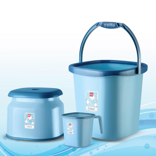 Cello Cubic Bathroom Set | Sturdy and Durable | Cubic Set (Bucket 18 L + Stool + Mug 1.5 L) | Lightweight and Rigid | Easy to Clean and Attractive Design | Set of 3 | Dark Blue