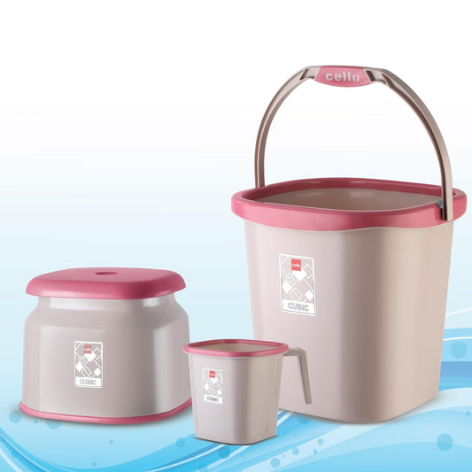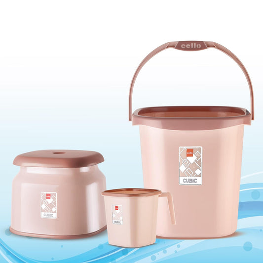 Cello Cubic Bathroom Set | Sturdy and Durable | Cubic Set (Bucket 18 L + Stool + Mug 1.5 L) | Lightweight and Rigid | Easy to Clean and Attractive Design | Set of 3 | Pink