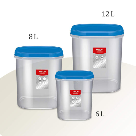 MILTON Plastic Quadra Storage Container, Set Of 3, (6000 Ml, 8000 Ml, 12000 Ml), Blue | Air Tight | Stackable | Multipurpose | Kitchen Organizer | Bpa Free | Easy To Clean | Dishwasher Safe