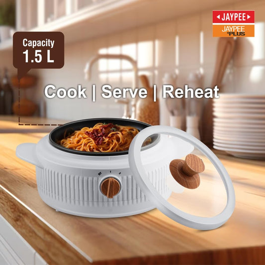 Jaypee Plus Electric CookSmart Casserole 3-in-1 Dual Cooking Station with Teflon NonStick Coating Bowl for Reheating & Cooking,Wooden Finish Lid & Regulator Knob Toughened Glass Lid,1.5+1.5 Ltr, Ivory