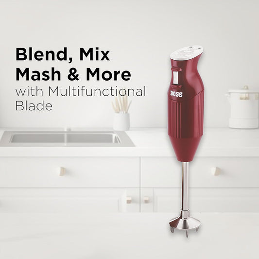 BOSS B132 Portable Hand Blender 225W - Watt | Variable Speed Control | 3 Years Warranty | Easy to Clean and Store | ISI-Marked, Maroon,Stainless Steel