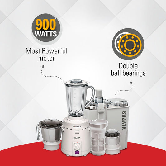 Sujata Multimix, Mixer Grinder with Juicer & Coconut Milk Extractor Attachment, 900 Watts, 3 Jars, (White)