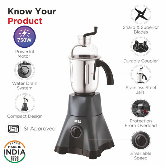 BOSS Cyclone-NX Mixer Grinder,750 Watt, 3-Speed with Overload Protection, 3 Jars, Grey