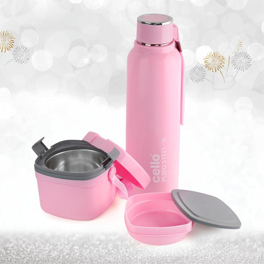 CELLO Puro Benz Stainless Steel Lunch & Bottle Gift Set |100 Percent Food Grade Material| Easy to Clean | Pink | Pack of 2