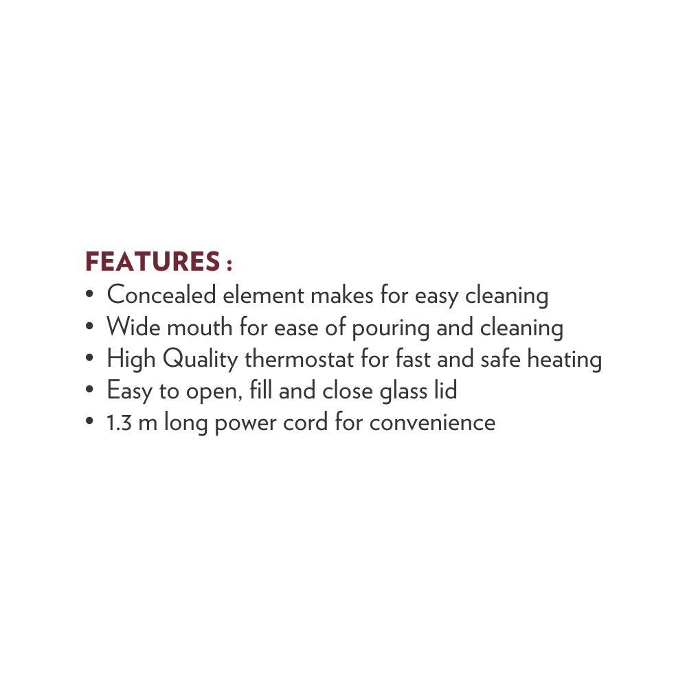 - Temperature control knob with light indicator; Concealed heating element for easy cleaning. Overheat Safety protection. Capacity: 1.5 liters