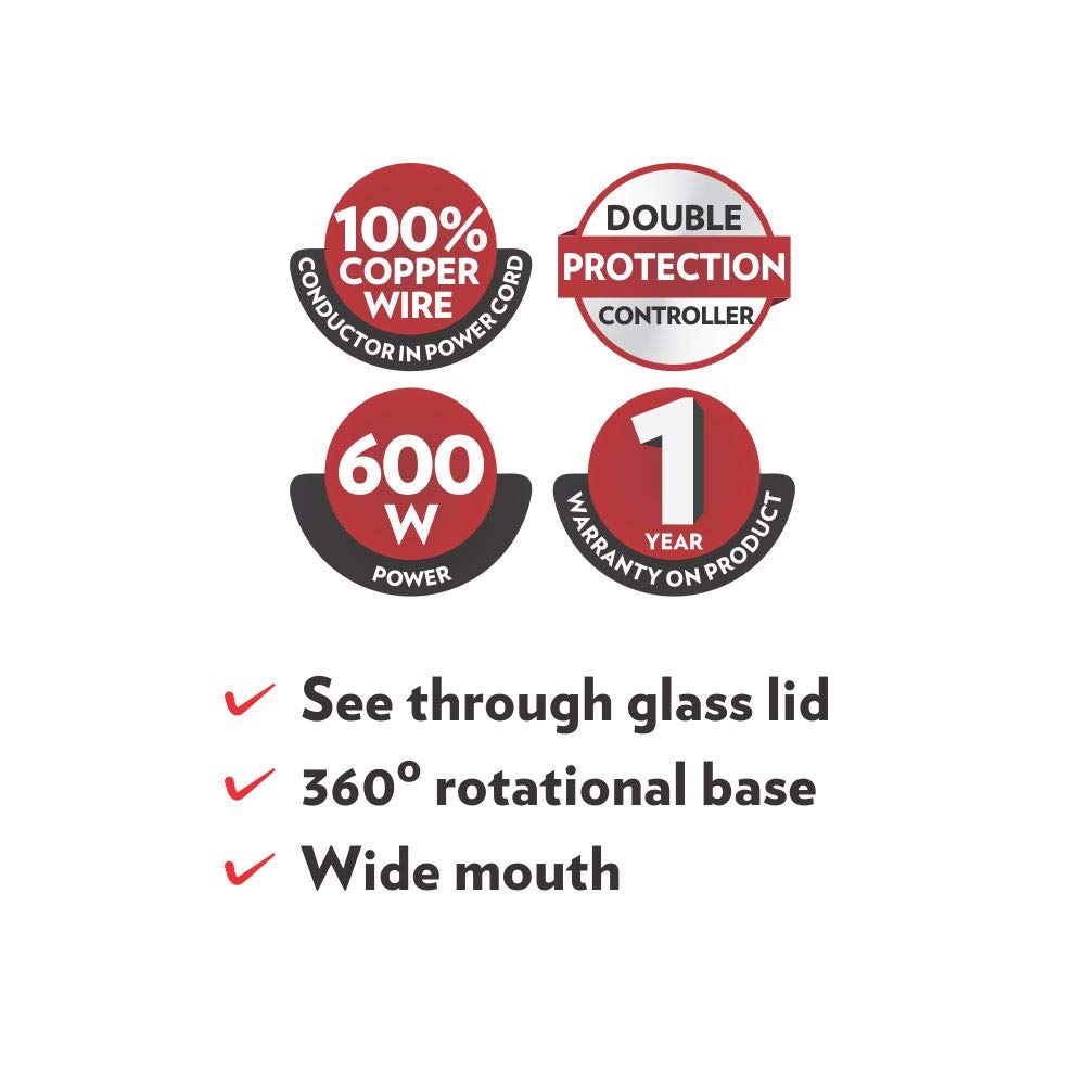 The kettle has a detachable, easy-to-fill & close glass lid. It also has a cord-winder for easy storage.
