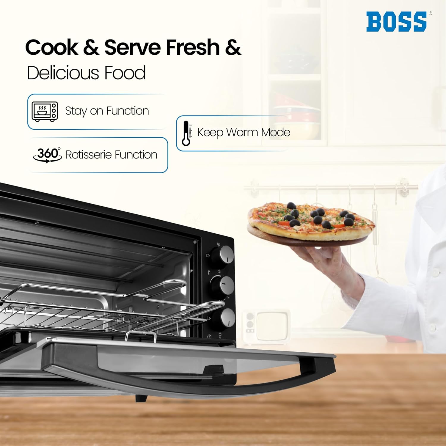 Discover a delicious and healthier way of cooking with this 30L BOSS Delish Oven Toaster Griller. Load your favourite delicacy onto the non-stick baking tray or motorized rotisserie for grilling. Be it Indian, Italian, Mexican or a dish of any other country that you have a hankering for, this OTG virtually transforms your kitchen into a world kitchen. Its 30 litres capacity allows you to experiment with just about any culinary delight. A Stay On function keeps all that you have prepared warm and fresh until it is served.