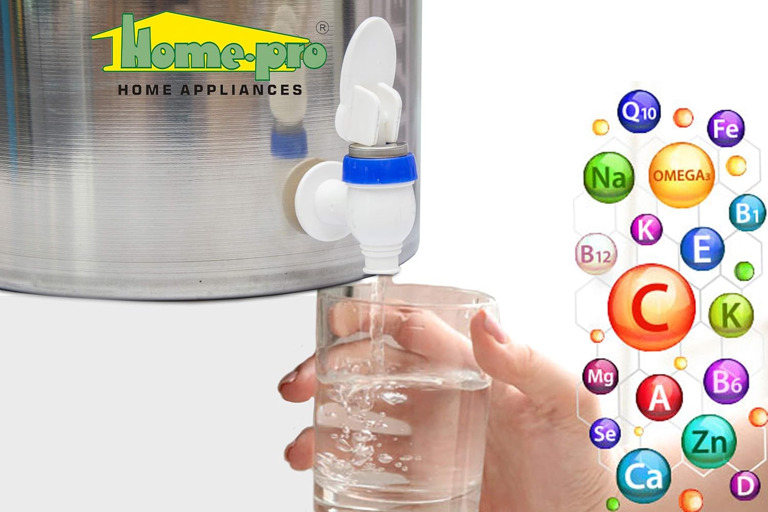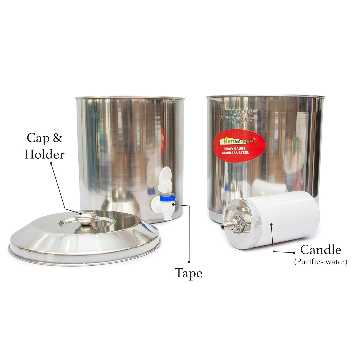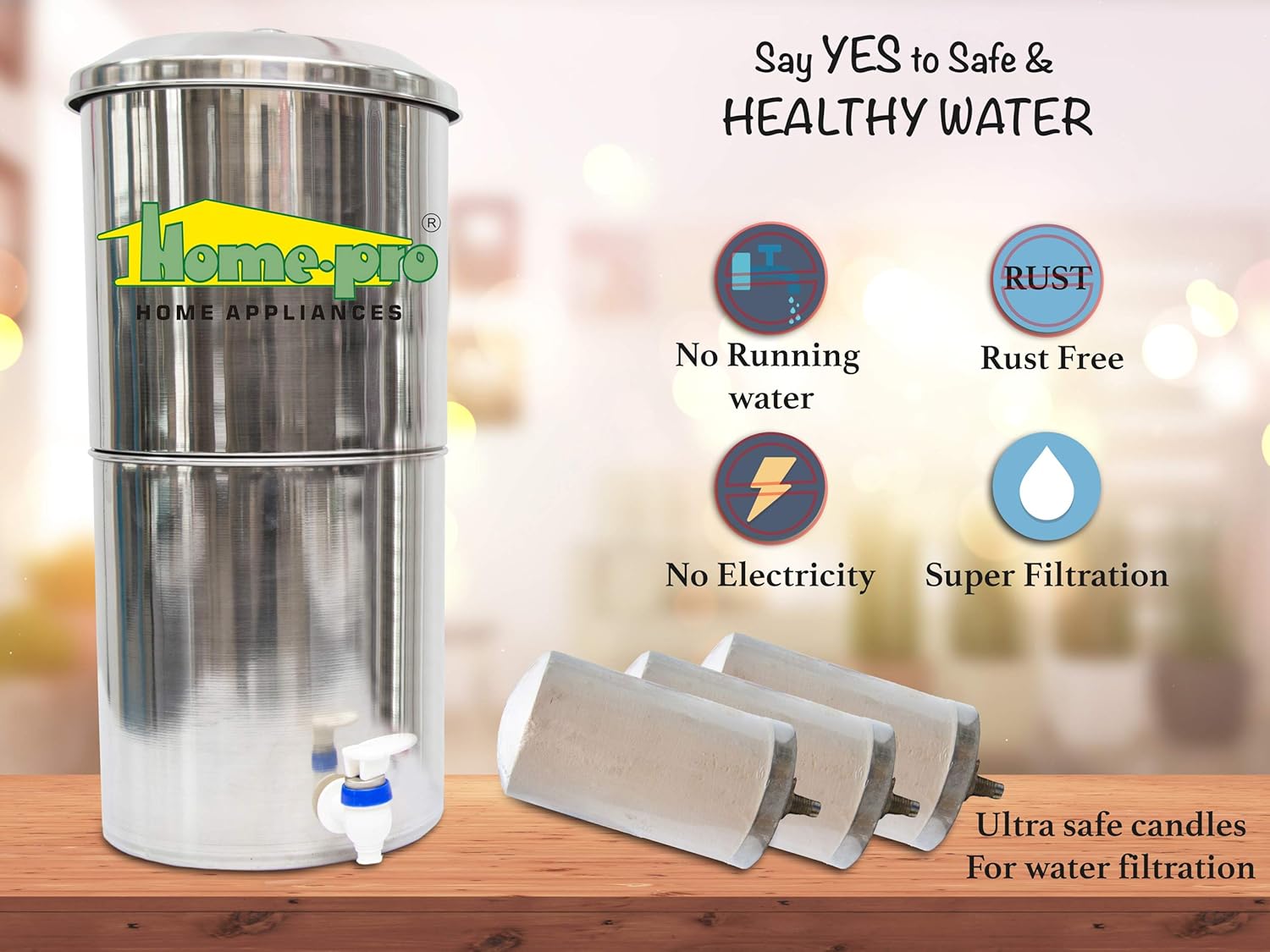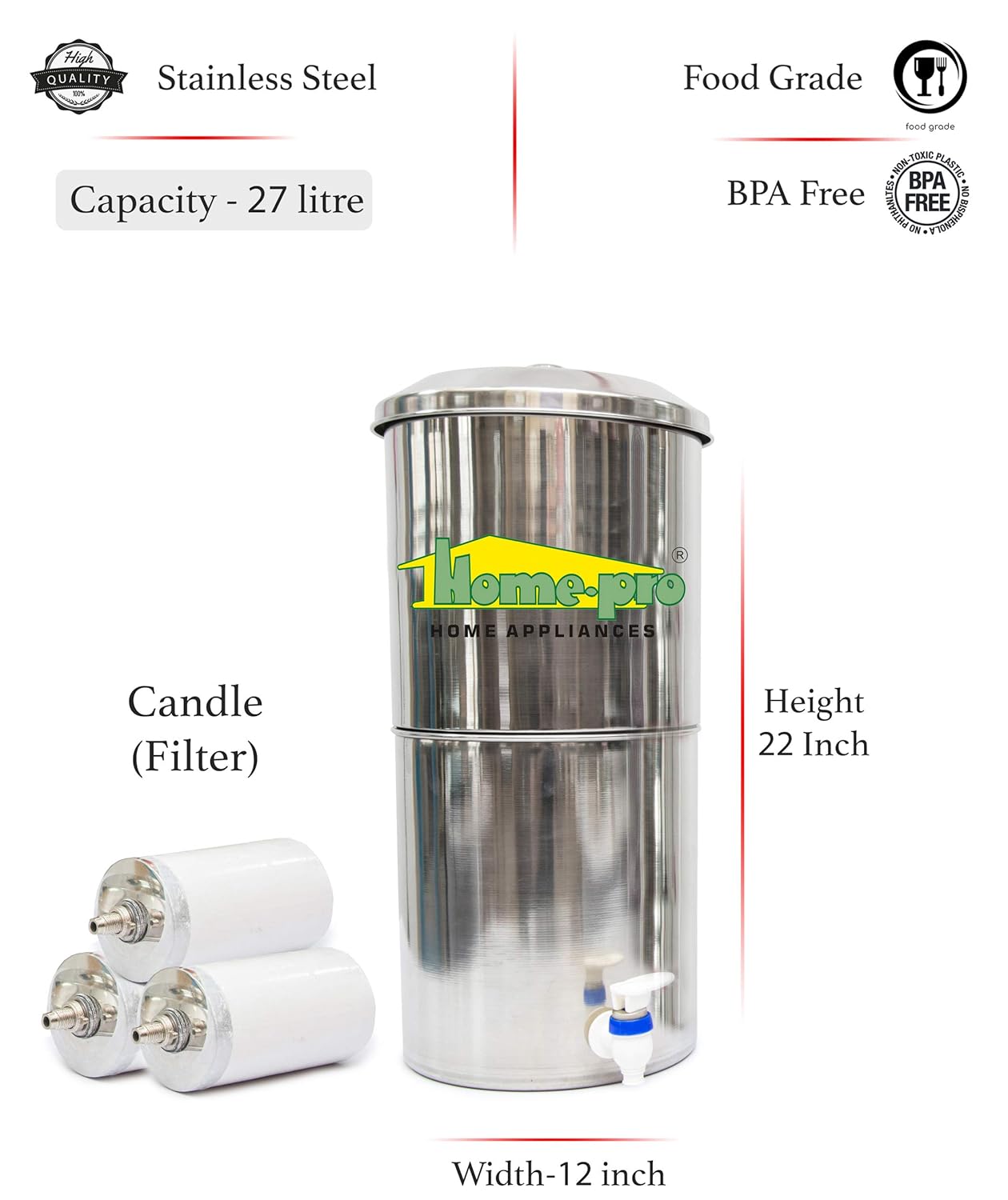 Home-Pro - Gravity Water Filter and Purifier | 27 Liters Total Capacity (14L Bottom & 13L Top) Made with Stainless Steel |Includes 3 Creamic Candle and Food Grade Plastic Tape