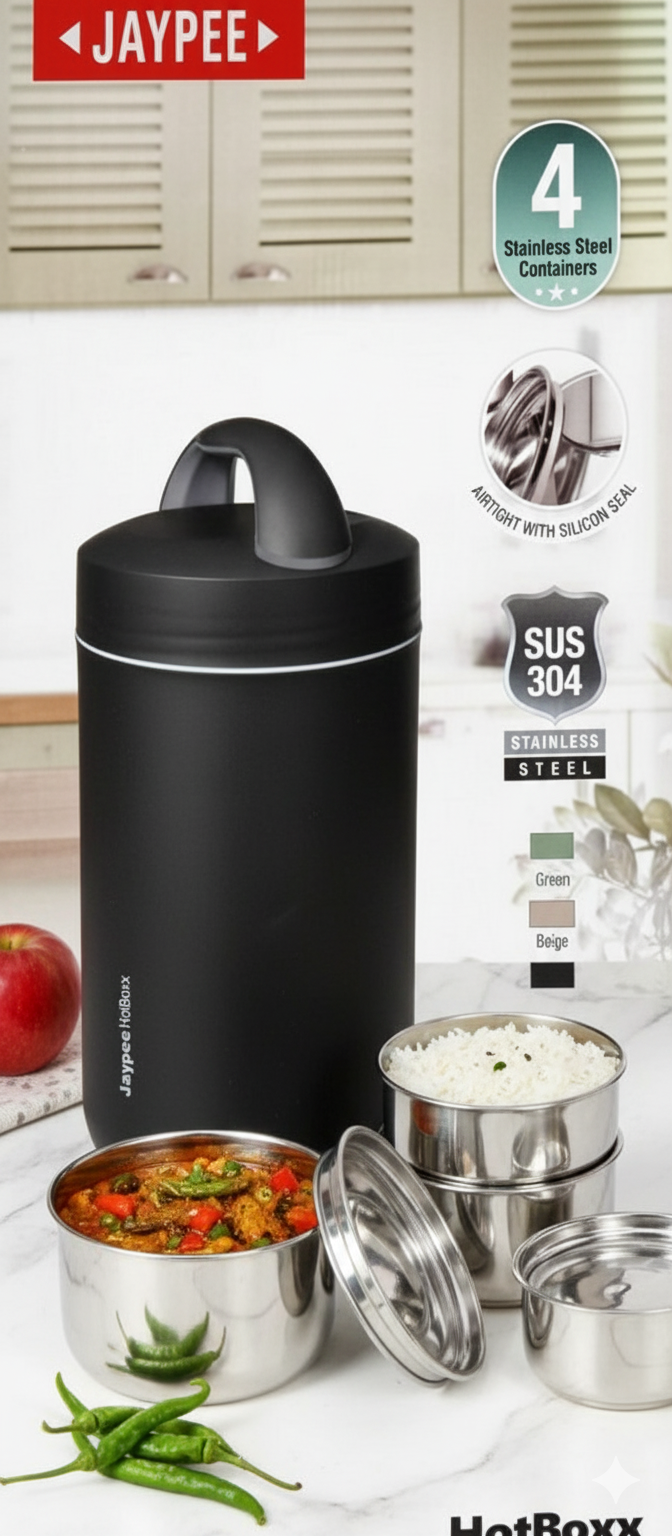Jaypee HotBoxx Insulated Lunch Box | 4-Tier Leakproof Tiffin with Assorted Size SUS 304 Stainless Steel Containers | Insulated Food Carrier for Office, School & Travel