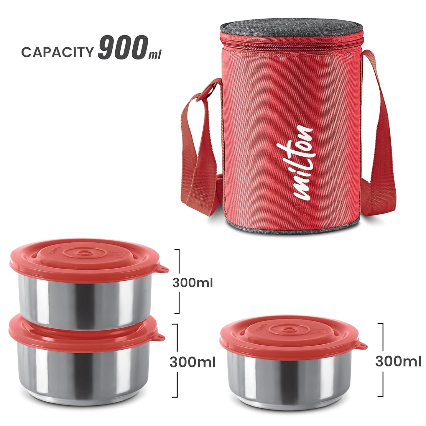 MILTON Ambition 3 Stainless Steel Tiffin, 3 Containers, 300 ml Each with Jacket, Red | Light Weight | Easy to Carry | Leak Proof | Food Grade | Odour Proof