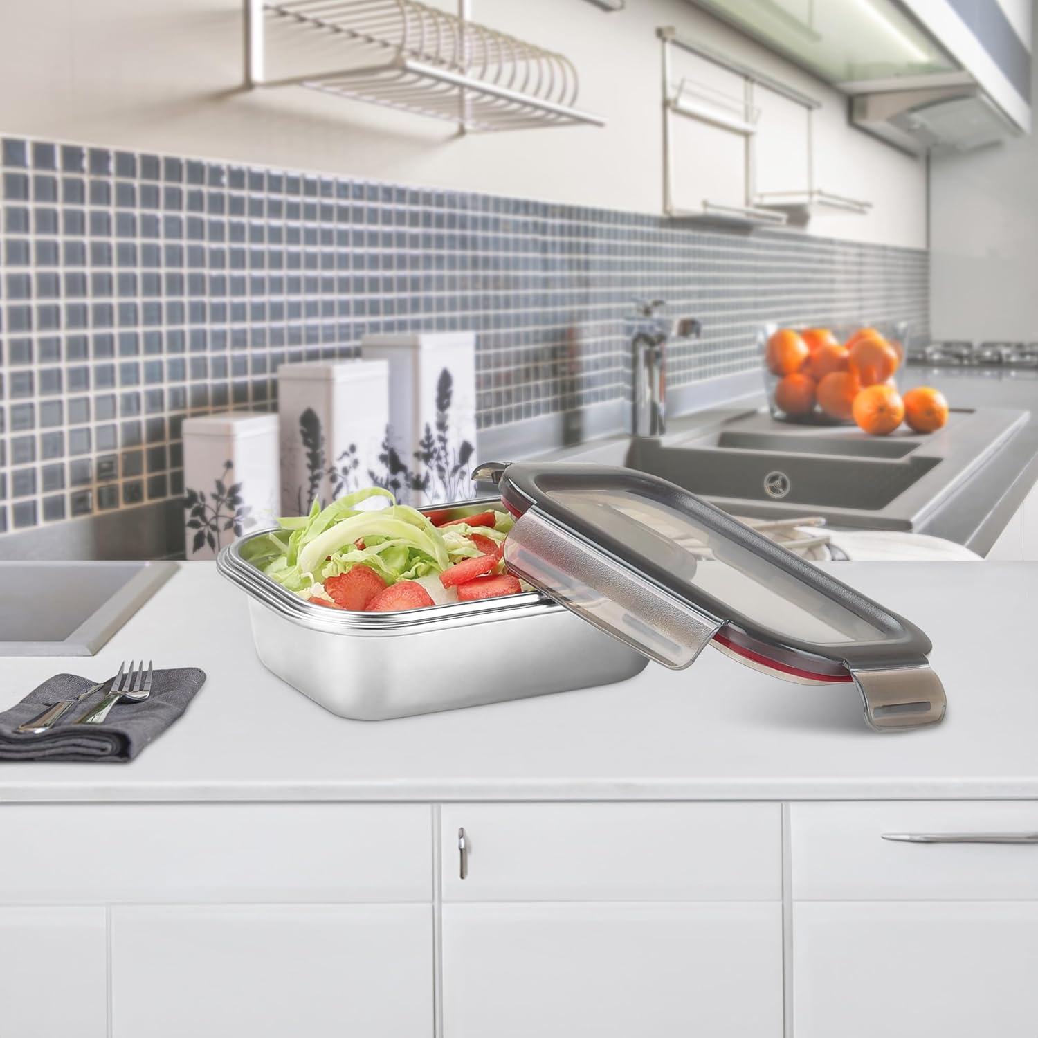 - Premium Stainless Steel Containers and Leak Proof Lids: Made from high-quality, food-grade stainless steel that resists rust, stains, and odors. Keeps food fresh and flavors intact. The BPA-free, airtight silicone-seal lids with four side locking helps the container to be securely seal, ensuring contents remain protected. The see-through plastic lid provides easy visibility and quick access to the container's contents without need to open it. The sleek design of the tiffin makes it easy to fit in the bag without occupying more space.