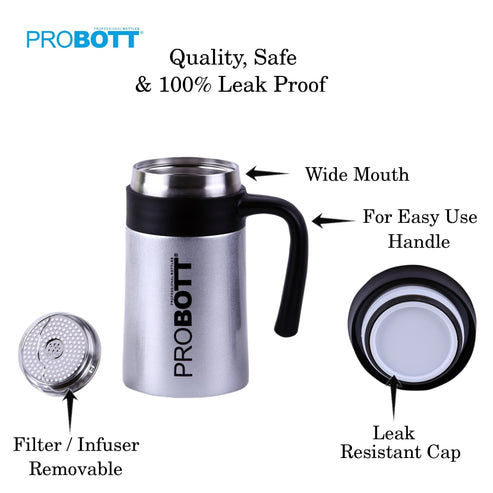 Probott Jazz 520ml Silver Vacuum Insulated Mug Stainless Steel Coffee Flask, Travel Flask