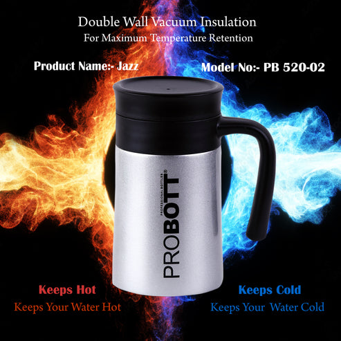 PROBOTT Jazz Vacuum Flask is a premium stainless steel mug designed to keep your beverages at the perfect temperature, whether hot or cold. With a generous 520 ml capacity, this flask is perfect for long journeys, outdoor adventures, or simply staying hydrated throughout the day. Constructed with high-quality stainless steel, this vacuum flask is durable and built to last. The double-walled insulation ensures that your drinks stay hot for up to 12 hours or cold for up to 24 hours, making it ideal for both hot coffee and chilled water. The vacuum-sealed cap prevents leaks and spills, so you can confidently toss it in your bag or backpack without worrying about messes. The cap also doubles as a cup, allowing you to enjoy your drinks on the go. The PROBOTT Jazz Vacuum Flask features a sleek black colour design that is both stylish and practical. Whether you're heading to the office, the gym, or out on a hike, this flask is the perfect companion. Say goodbye to single-use mug and switch to the eco-friendly PROBOTT Jazz Vacuum Flask. Not only is it better for the environment, but it's also easy to clean and maintain. Simply rinse with warm water and soap, or toss it in the dishwasher for a thorough clean. With its combination of style, functionality, and eco-friendliness, the PROBOTT Jazz Vacuum Flask is the perfect choice for anyone looking for a high-quality water bottle that can keep up with their busy lifestyle. Make the switch to the PROBOTT Jazz Vacuum Flask and join the movement towards a more sustainable future. With its durable construction and eco-friendly design, this flask is the perfect choice for anyone looking to reduce their environmental footprint. Stay hydrated, stay stylish, and stay sustainable with the PROBOTT Jazz Vacuum Flask